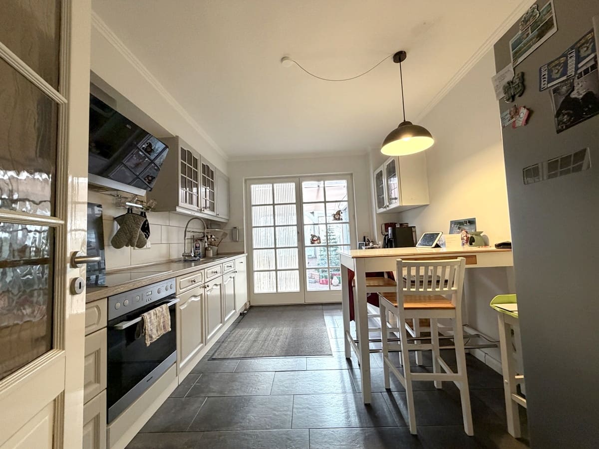 Herzstück ist das lichtdurchflutete Wohnzimmer im Erdgeschoss mit breiter Fensterfront und Zugang zum Wintergarten – ein Ort zum Entspannen und Genießen zu jeder Jahreszeit. Die moderne, helle Einbauküche mit direktem Gartenzugang lädt zum gemeinsamen Kochen und Verweilen ein.